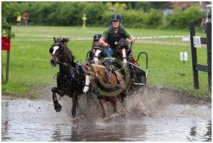 Regerend wereldkampioen Ewoud Boom, die gisteren al een zeer sterke dressuur en vaardigheid reed, behield de eerste positie bij de tweespan pony’s, ondanks een vierde positie in de marathon. In diezelfde groep brak bij Karel van Kekem de dissel in hindernis 3, zodat hij genoodzaakt was te stoppen.
