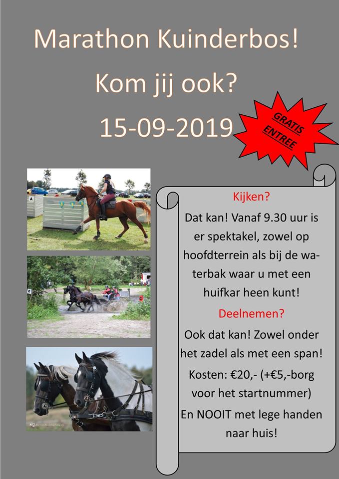 Op 15 september wordt in het Overijsselse Kuinre de jaarlijkse impulsmarathon georganiseerd door de menvereniging van PSV De Burcht.Sinds een aantal jaren is deze wedstrijd voor zowel menners als ruiters opengesteld. De negen hindernissen, waaronder de waterbak, liggen allemaal in en om het Kuinderbos en de organisatie meldt dat het ‘weg’ – traject volledig in het bos ligt zodat hoefijzers niet noodzakelijk zijn om deel te nemen.
