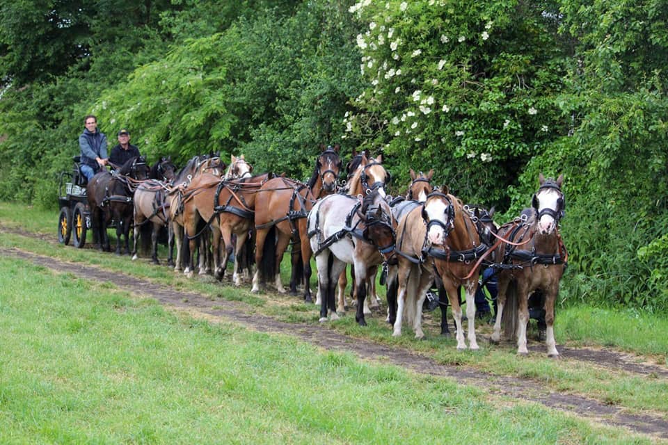 Terwijl Kenny Kanora en Nick Weytjens met hun 16-span reden, waren ook een paar fanatieke menners in Schalkwijk afgelopen zondag bezig om 16 pony’s in te spannen.Dexter Biersteker en Eline Geurs reden met zes pony’s naar de familie Leliveld in Schalkwijk. Daar werden ze samen met 10 pony’s van jeugdmenners Raymon en Jelle Leliveld aangespannen in een 16-span. Een hele klus, waarvoor ook de nodige hulp was opgetrommeld. Het was zo geregeld dat de hulptroepen keurig op anderhalve meter afstand van niet-familieleden een pony begeleidden.