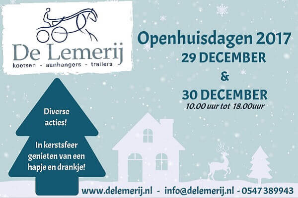 Ook dit jaar organiseert De Lemerij de openhuisdagen. Dit gezellige evenement vindt plaats op vrijdag 29 en zaterdag 30 december van 10.00 uur tot 18.00 uur.Tijdens deze dagen kunt u onder het genot van een hapje en een drankje genieten van de gezellige kerstsfeer in de showroom. Team De Lemerij laat u een uitgebreid assortiment van koetsen, tuigen en aanverwante mensport artikelen zien. In de showroom staan zowel nieuwe als gebruikte koetsen en het is uiteraard mogelijk een nieuwe koets naar wens samen te stellen.