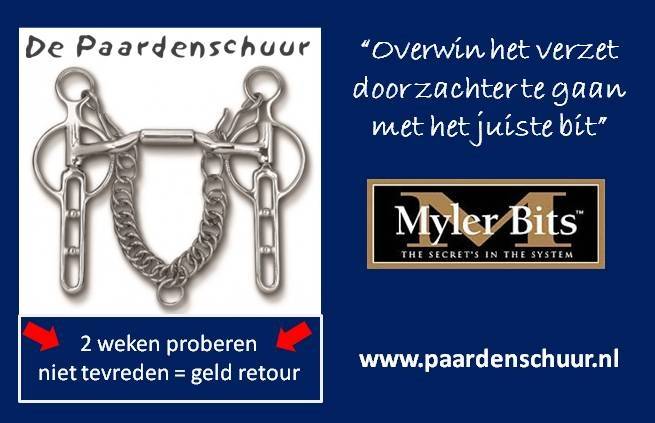 Dit jaar staat “De Paardenschuur” met Myler menbitten op Paard & Koets! Het idee achter het Myler menbit: overwin het verzet door ‘zachter te gaan’ met het juiste bit. Iedere combinatie, van paard en menner, heeft zijn eigen speciale vereisten en vraagt om het juiste bit."De Paardenschuur" gaat er van uit dat uw paard het Myler menbit met veel plezier draagt, maar het kan altijd dat het niet aan de verwachtingen voldoet. "De Paardenschuur" biedt u de service om de aankoop binnen 14 dagen te retourneren.
