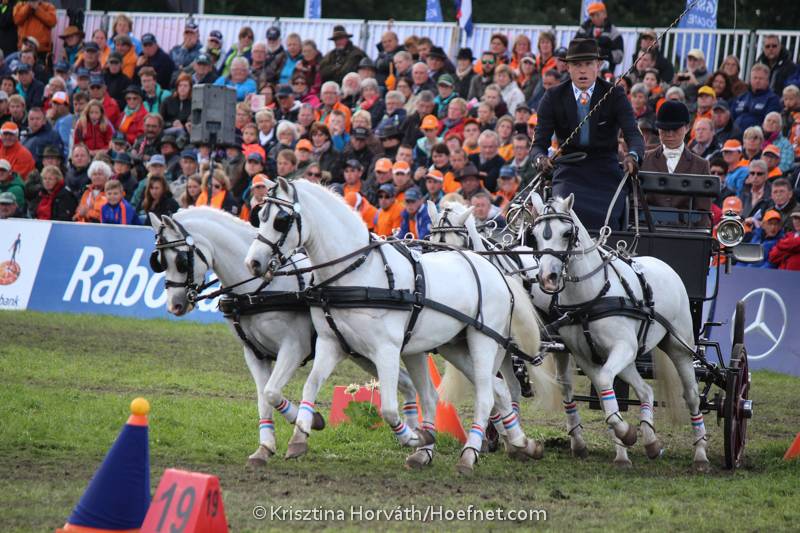 Wanneer de pony’s eenmaal weer in tweespan staan zal de “luie” pony met stem en zweephulpen aangemoedigd moeten worden naar voren te lopen, maar het is erg belangrijk dat de hulpen de “hetere” pony niet storen! Een stemhulp die bedoeld is voor de “luie”, zet ook vaak de “hete” aan tot actie. Het is daarom aan te raden een zweep te gebruiken met een korte slag, zodat de “hetere” pony niet geraakt wordt.