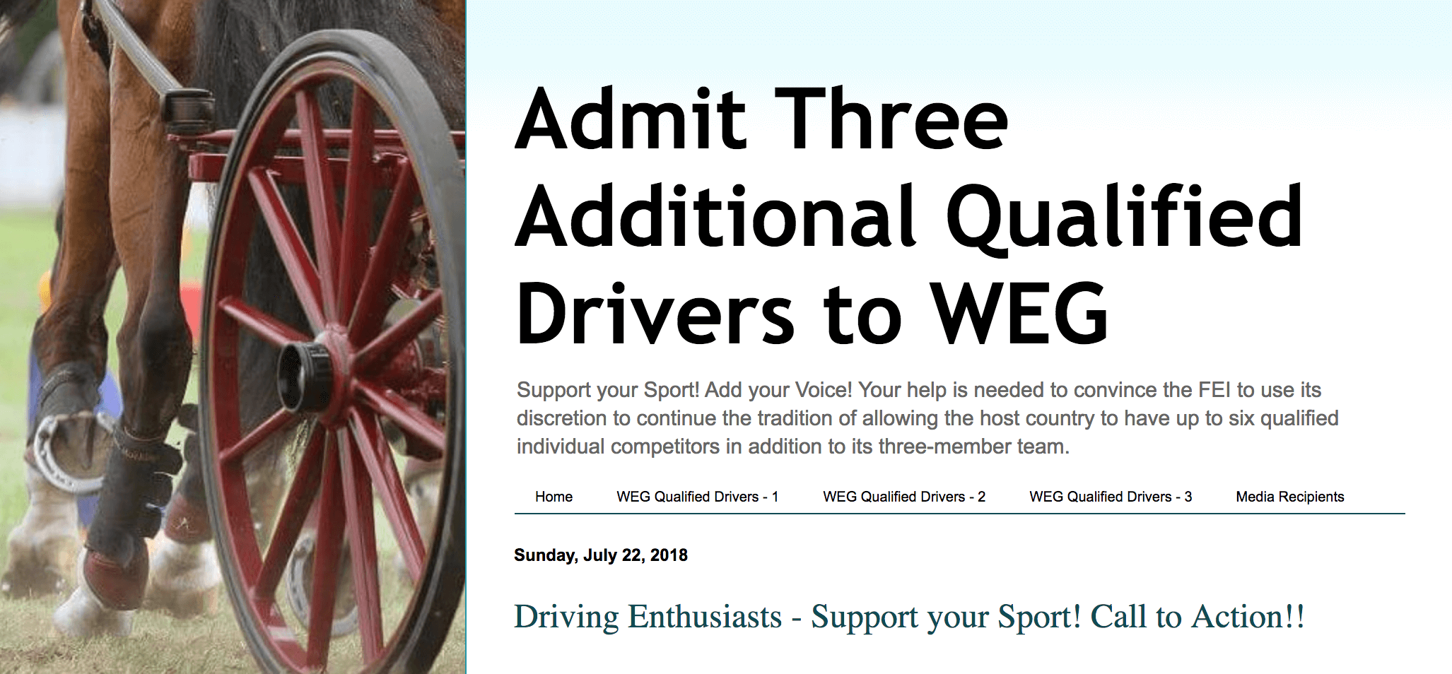 Een groep enthousiaste Amerikaanse menfans is een petitie gestart om drie extra Amerikaanse menners een startplaats te bezorgen op de Wereldruiterspelen in Tryon.Op dit moment ziet het er naar uit, dat er hooguit 15 tot 20 menners zullen deelnemen. Gastland Amerika mag drie rijders sturen, maar wil graag drie extra gekwalificeerde vierspanrijders aan de start laten komen.