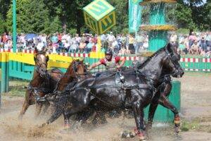 Neben den nationalen Titelkämpfen fahren die Vierspänner außerdem das Internationale Deutsche Fahrderby aus, eine weltweit einzigartige Prüfung aus mehreren Teilwertungen. Hier müssen die Vierspännerfahrer nicht nur in der Dressur, im Gelände und beim Hindernisfahren ihr Können an den Leinen unter Beweis stellen, sondern außerdem bei der Jagd um Punkte besondere Geschicklichkeit und starke Nerven zeigen. Als Titelverteidiger tritt Michael Brauchle an. Riesenbeck ist für den 24-jährigen aus Lauchheim-Hülen ein exzellentes Pflaster. Bereits an gleicher Stelle war er 2012 Vize-Weltmeister mit dem deutschen Team geworden.