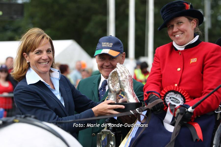 Überreicht von Bettina de Rham (FEI) wurde diese wundervolle Trophy in diesem Jahr an das Team Lindsey Tyas-Paice, britische Fahrerin, die bereits 1994 am ersten internationalen Para-Fahrturnier in Hartpury/GBR und bis auf 2002 an allen Weltmeisterschaften im Para-Fahrsport teilgenommen hat, und den irischen Zweispänner-Fahrer Barry Capstick.