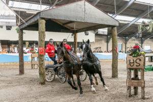 Bij de tweespan pony’s reed de als vijfde geplaatste Ariena Kleijer foutloos in 126,11. Met haar kleine pony’s kon Kleijer draaien op een dubbeltje en vervolgens beet iedereen zich stuk op haar gereden tijd. Een dolgelukkige Kleijer won en zeker zo blij was tweede prijswinnaar Peter Baars, die de Westelijke Districtstitel pakte.