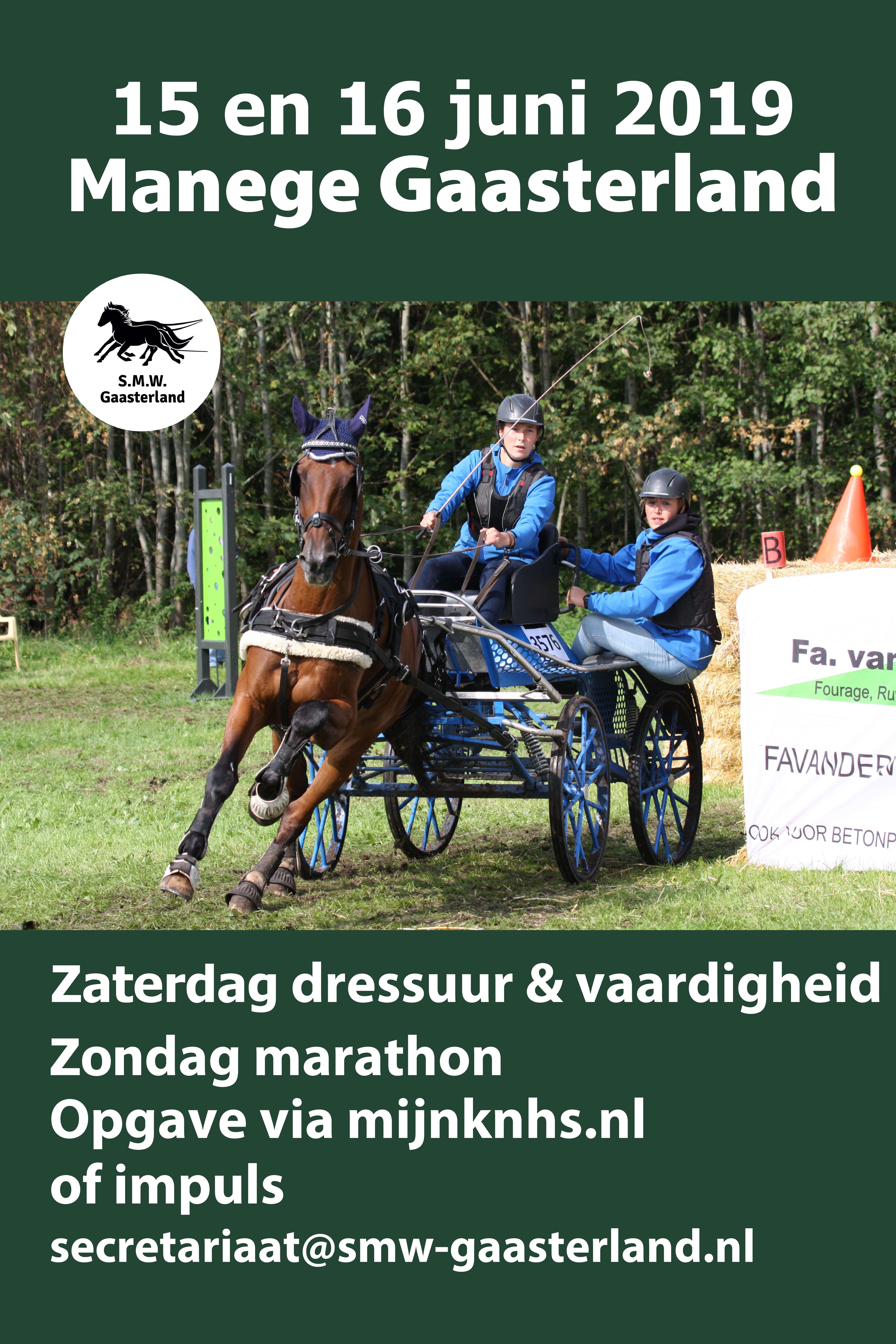 Stichting Manege Gaasterland en de 'Friese Aanspanning' organiseren op 15 en 16 juni voor de 38ste keer SWM Gaasterland. De wedstrijd is opengesteld voor alle klassen.Op zaterdag worden de dressuur en de vaardigheid verreden. De dressuur op mooie vlakke grasbanen waarbij de FEI proef in een 40 x 100 meter ring gereden wordt. De vaardigheid vindt plaats op een all-weather bodem van 80 x 80 meter.