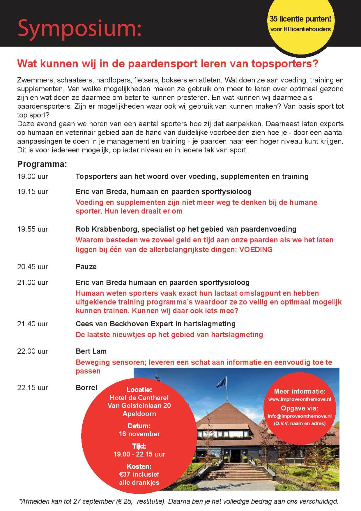 Het symposium op 16 november in Apeldoorn met als thema 'Wat kunnen wij in de paardensport leren van topsporters' gaat niet door in verband met te weinig deelname.Voor het symposium waren meerdere sprekers uitgenodigd. Het minimum aantal benodigde deelnemers om uit de kosten te komen is helaas niet bereikt.