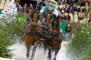 Theo Timmerman heeft de Deutsche Fahrderby in Riesenbeck gewonnen. De vice-Nederlands Kampioen van afgelopen weekend in Beekbergen won de marathon en bleef foutloos in de vaardigheid waardoor hij 20 punten kon laten bijschrijven op de Wereldbekerkwalificatielijst, waarin hij is opgeklommen naar de 5e plaats.Timmerman begon de Fahrderby, bestaande uit een tweetal dressuurproeven met tweespan, een vierspandressuurproef en vervolgens de marathon en vaardigheid met vierspan, goed met de derde plaats in de vierspan dressuurproef. In de marathon bleef hij concurrent Christoph Sandmann op een haar na voor en eiste de winst voor zich op in dit onderdeel. Sandmann, die in Riesenbeck met zijn Duitse collega’s gelijktijdig streed in het Duits vierspankampioenschap, ging voor de vaardigheid aan de leiding, maar tikte er een balletje af en liet tijdsoverschrijding noteren. Timmerman had even tevoren een dubbele foutloze ronde neergezet waardoor de winst in het eindklassement naar de menner uit Putten ging. De Australiër Boyd Exell was uit tactische en trainer-technische redenen niet als deelnemer aanwezig in Beekbergen vorig weekend, maar startte wel in Riesenbeck. Met zijn tweede plaats in het totaalklassement heeft Exell de leiding weer overgenomen van Chardon in het tussenklassement van de Wereldbekerkwalificatie na negen wedstrijden.
