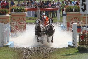 Barry Capstick, na de dressuur op de 2e plaats, kwam ongelukkig ten val na een slippartij in de waterbak. Hij kon de wedstrijd niet vervolgen.