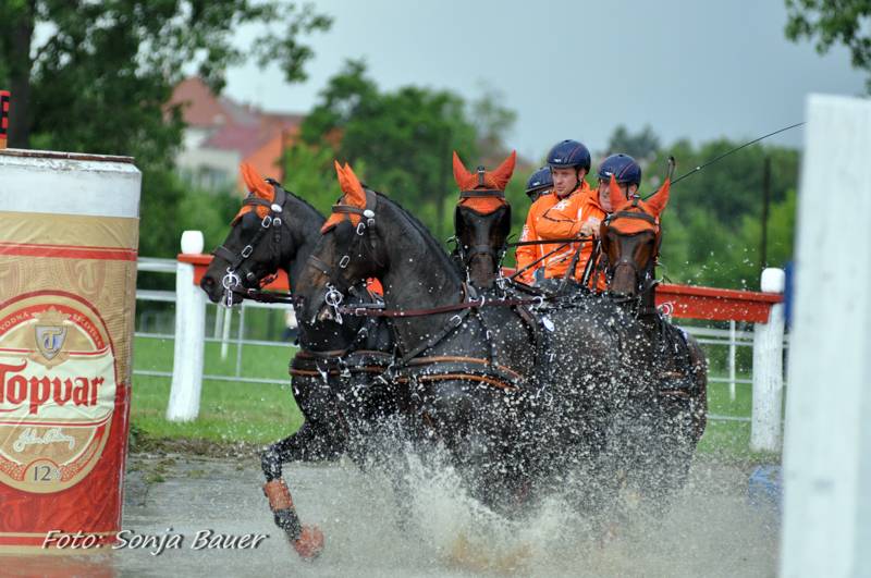Hans Heus reed vanmiddag een sterke marathon in Topolcianky en is met zijn vierde plaats in dit onderdeel opgeklommen naar de zevende plaats in het tussenklassement. De Hongaarse vierspanrijder Lajos Moro gaat aan de leiding nadat de leider na de dressuur Zoltán Lázár zijn groom verloor in de voorlaatste hindernis.Het was vandaag een enerverende marathon. Rond de middag barstte het onweer los en door de hevige regenval werd de bodem in de hindernissen zeer glad. Hindernis twee werd er voor de vierspannen uitgehaald aangezien de enkel-en tweespannen te veel schade hadden aangericht waardoor er voor de vierspannen een gevaarlijke situatie kon ontstaan.