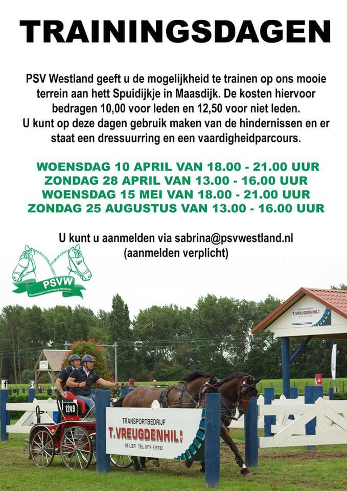 Op de mooie terreinen van PSV Westland in Maasdijk wordt een aantal trainingsmiddagen- en avonden georganiseerd. Behalve het trainen van de marathonhindernissen, kun je ook een vaardigheidsparcours rijden. En er ligt een dressuurring op het veld: dus ook een prima oefengelegenheid voor de dressuur.Op de volgende data is het terrein beschikbaar voor trainingen:
