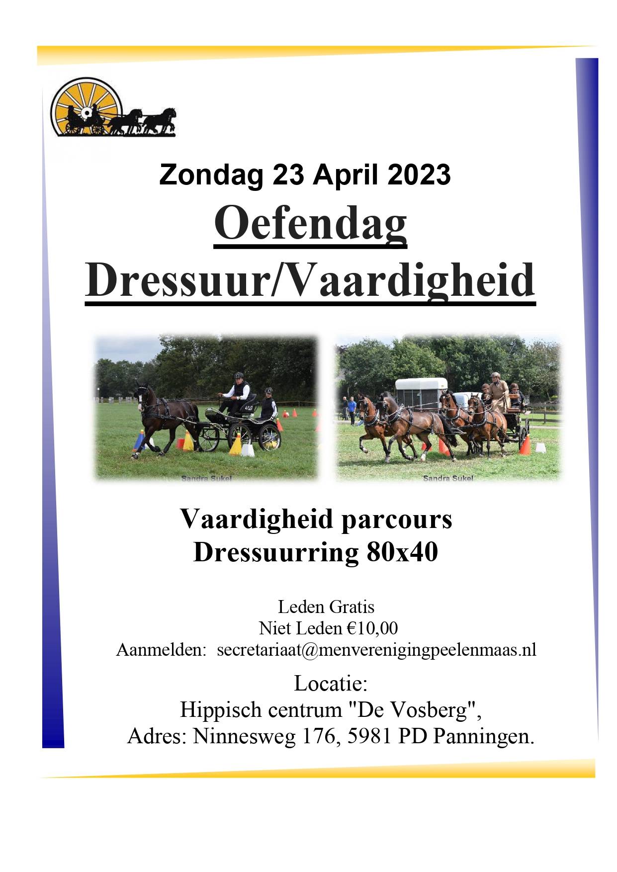 Wegens grote belangstelling en succes herhaald ... Menvereniging Peel en Maas organiseert op zondag 23 april een oefendag om vrijblijvend en zonder beoordeling je dressuurproef of een vaardigheidsparcours te rijden. Deze vindt plaats op de mooie en ruim opgezette grasvelden van Manege De Vosberg in Panningen, waar dit jaar ook de districtskampioenschappen dressuur en vaardigheid georganiseerd worden.Het concept is dezelfde als tijdens de oefendag in maart.