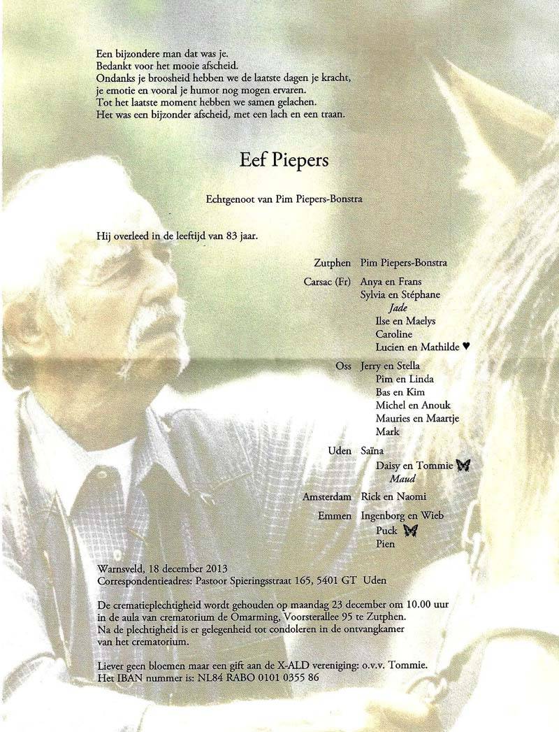21 december 2013 Uitvaart Eef Piepers Eef Piepers wordt maandag 23 december door Johan Haasnoot uit Kerkdriel met de rouwkoets naar het crematorium "Omarming" in Zutphen gebracht waar de rouwdienst om 10.00 uur begint. Klik hier voor de rouwkaart.