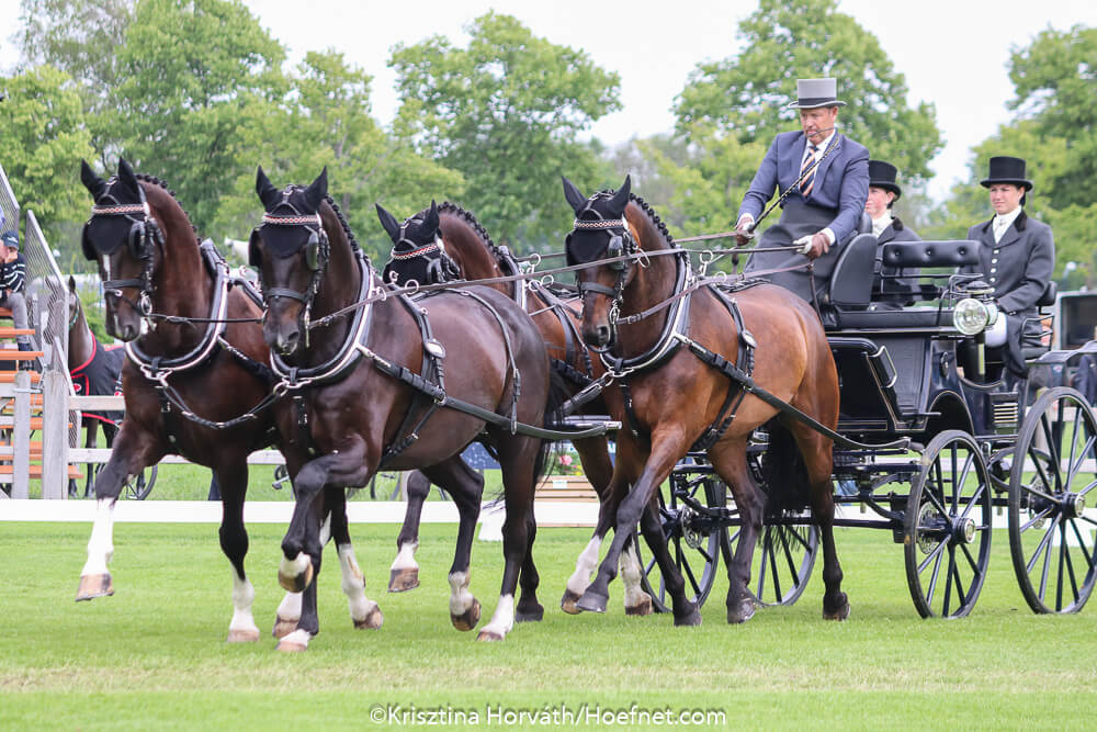 Onder ideale weersomstandigheden was het vandaag de beurt aan de vierspanrijders om hun dressuurproef te rijden.IJsbrand Chardon had zijn paarden in vorm. Hij toonde een mooie foutloze proef die werd beloond met 41,39 strafpunten. Hij staat nu tweede. Ook de proef van de Fransman Benjamin Aillaud mocht er zijn. Hij deed weinig onder voor Chardon, maar het halthouden en achterwaarts werd door Chardon beter uitgevoerd. Aillaud kreeg 43,58 punten, wat goed was voor de derde plek. Koos de Ronde reed ook een degelijke proef en bracht met Chardon het Nederlandse team aan de leiding in de landenwedstrijd.