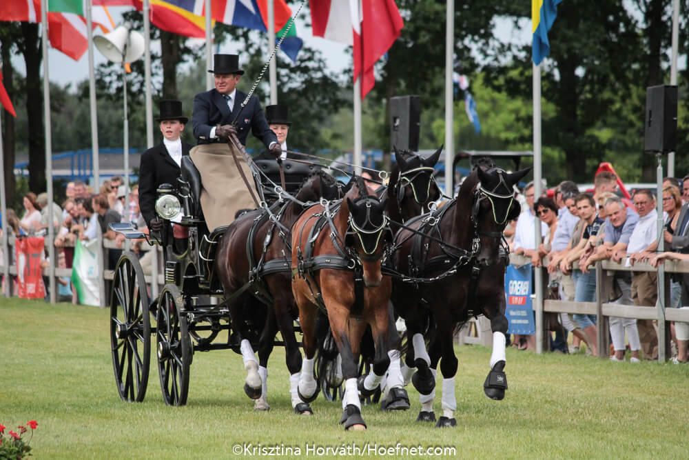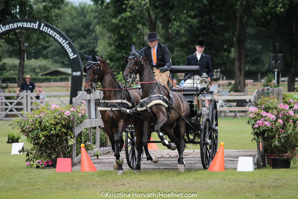 Driving Valkenswaard International beleefde vandaag een prachtige, zonnige dag met de afsluitende vaardigheid van de internationale driesterrenwedstrijd voor twee-en vierspan paarden. Het aanwezige publiek genoot met volle teugen van het mooie parcours met brug en de spanning in de tweespanrubriek, waar de uitslag na de marathondag absoluut nog niet vast stond.Bij de vierspan paarden kon gastheer Boyd Exell de zege bijna niet meer ontlopen en dat gebeurde dan ook niet: met ruime voorsprong won hij de wedstrijd op eigen terrein voor de tweede opeenvolgende keer.