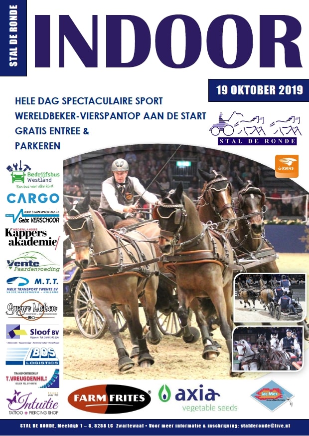 Tijdens de Indoor Zwartewaal op zaterdag 19 oktober vindt de eerste grote generale repetitie plaats voor het komende wereldbekerseizoen voor vierspannen. Een groot deel van de wereldtop vierspannen is aanwezig op de locatie van gastheer Koos de Ronde.Een uniek deelnemersveld van maar liefst twaalf vierspanrijders uit zes landen die het evenement gebruiken als laatste test, voordat de Indoor-Worldcup in het Franse Lyon van start gaat.