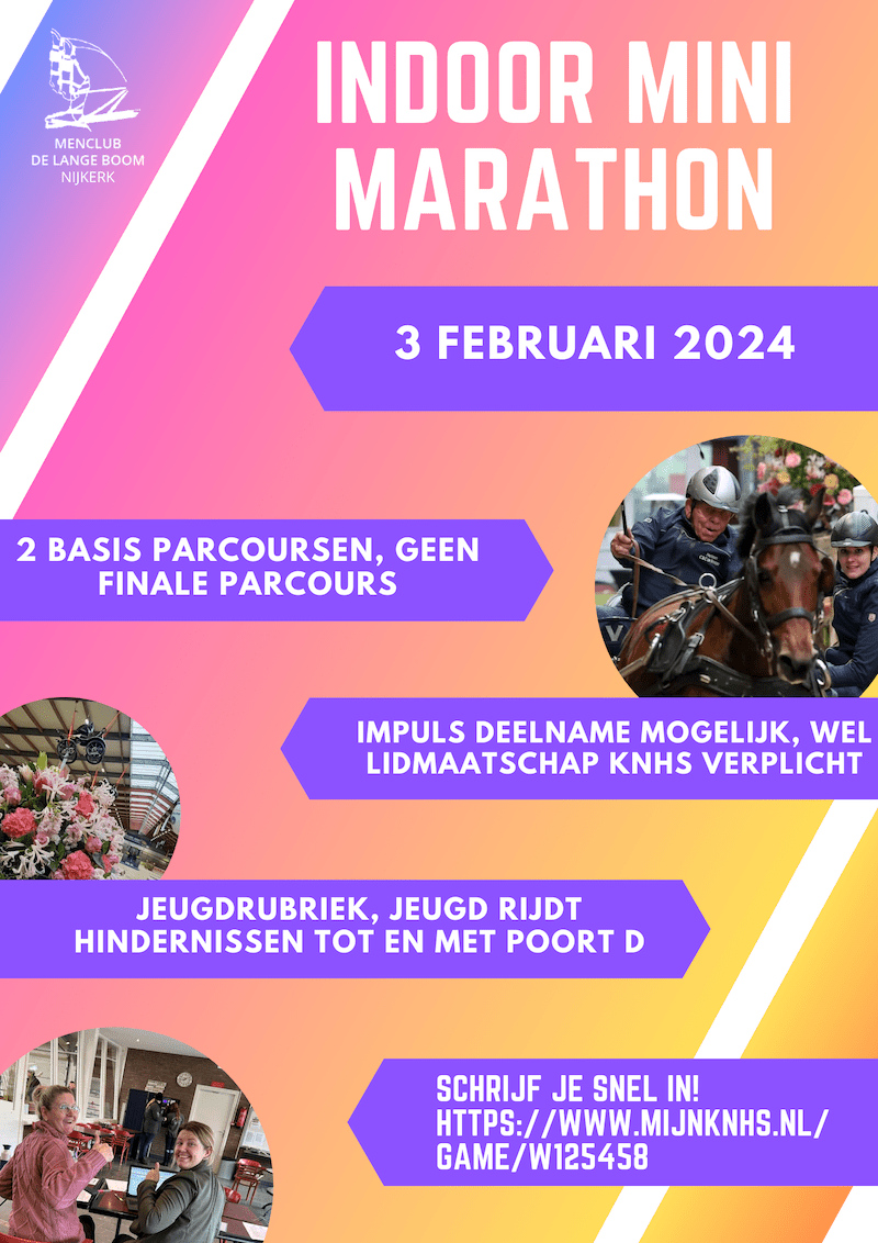 De grote Menindoor Nijkerk is nog maar net voorbij en de voorbereidingen voor de minimarathon worden alweer getroffen. Op zaterdag 3 februari organiseert Menclub de Lange Boom deze minimarathon.Het totaal van de twee basisparcoursen zal de einduitslag bepalen, er wordt geen finale gereden. Deze wedstrijd leent zich voor een ieder die op welke wijze dan ook lid is van de KNHS, bijvoorbeeld het lidmaatschap van een vereniging. Een startkaart is niet nodig. De jeugd rijdt een aangepast parcours, zij rijden de hindernissen tot en met poort D.