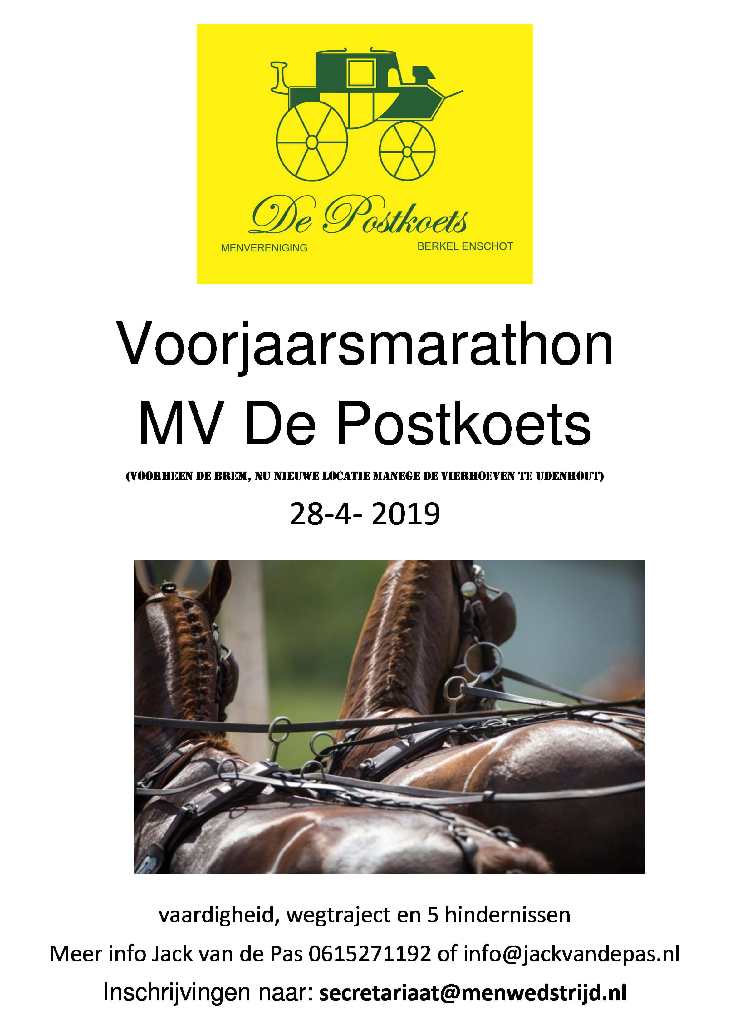 Op 28 april organiseert MV De Postkoets een impulsmarathon, bestaande uit een vaardigheid, aansluitend een wegtraject en vijf hindernissen in de omgeving van Manege de Vierhoeven in Udenhout.Deze impulswedstrijd is in de plaats gekomen van de jaarlijkse oefendag bij ‘De Brem’ . De vaardigheid is buiten, waarna aansluitend het wegtraject gereden wordt. Enkele hindernissen bevinden zich in de mooie rijhal van RSV St. Lambertus en zijn goed te zien vanuit de kantine van Manege de Vierhoeven. De overige hindernissen staan buiten.