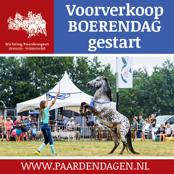 De gezelligste familiedag van het jaar, de 'Boerendag' wordt op 27 juli voor de dertigste keer georganiseerd. De groep vrijwilligers van het eerste uur wil dit jubileum niet ongemerkt voorbij laten gaan, en heeft een heuse men-show met dertig menners en grooms in elkaar gezet. Allemaal vaste gezichten op de Paardendagen Driezum - Wâlterswâld, die als slotact de toeschouwers trakteren op een wervelende show, waarin zij de meest spectaculaire onderdelen overdoen uit alle voorgaande edities van het evenement. "Voor elkaar en met elkaar", dat is al jaren de slogan van de Paardendagen Driezum-Wâlterswâld!Met ruim vijftig standhouders vermaakt jong en oud zich op de Boerenmarkt, maar er is meer: een bungee trampoline, een veld vol trekkers en oldtimers, de jaarlijkse vee- en geitenkeuring, de show van het ‘Heavy Horses Showteam’ en ook de demo vrijheidsdressuur van Famke Dijkstra wil je niet missen! Van hapjes en drankjes tot de muziek: alles is tot in de puntjes geregeld voor de allerkleinsten tot de ‘oldtimers’ onder ons.