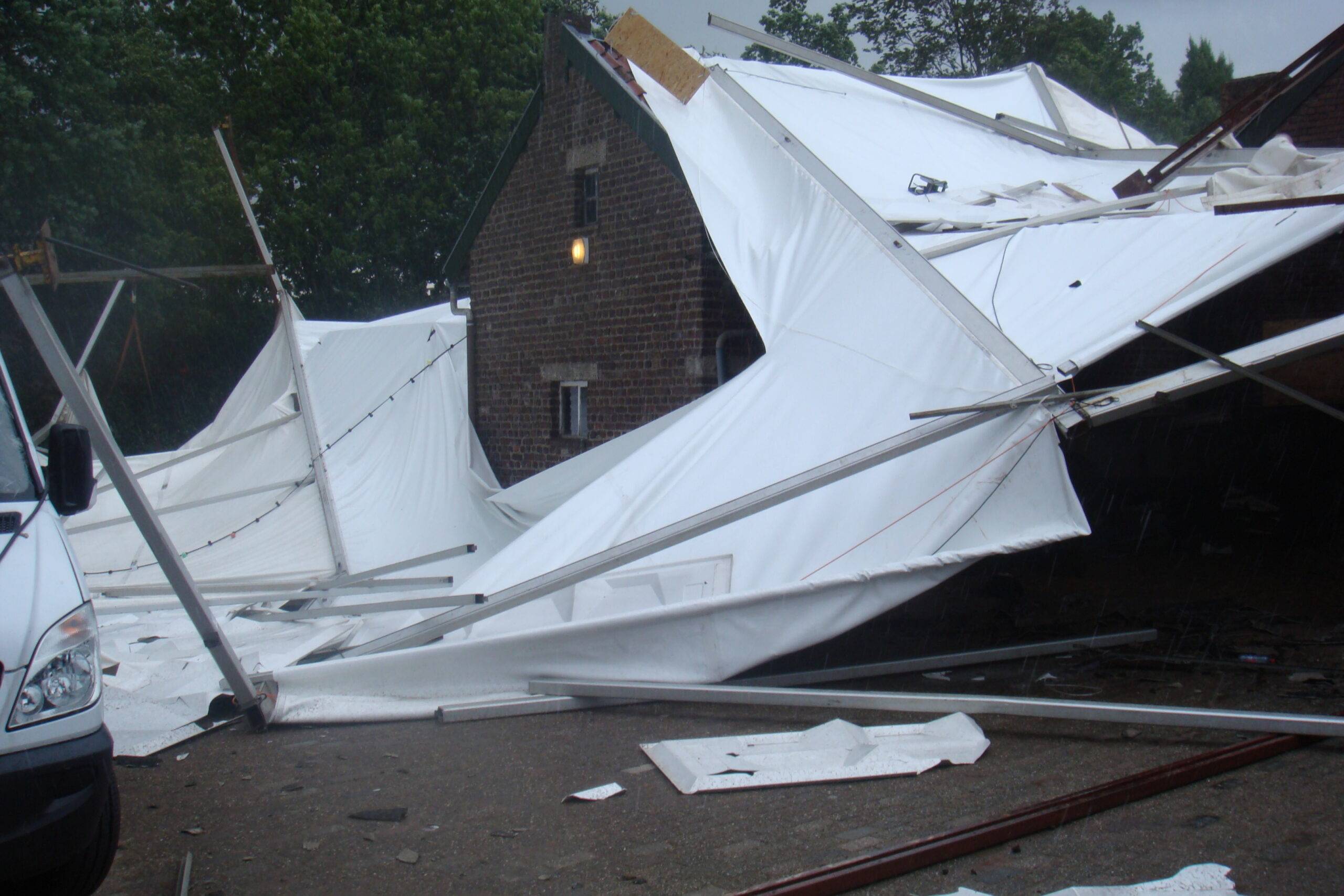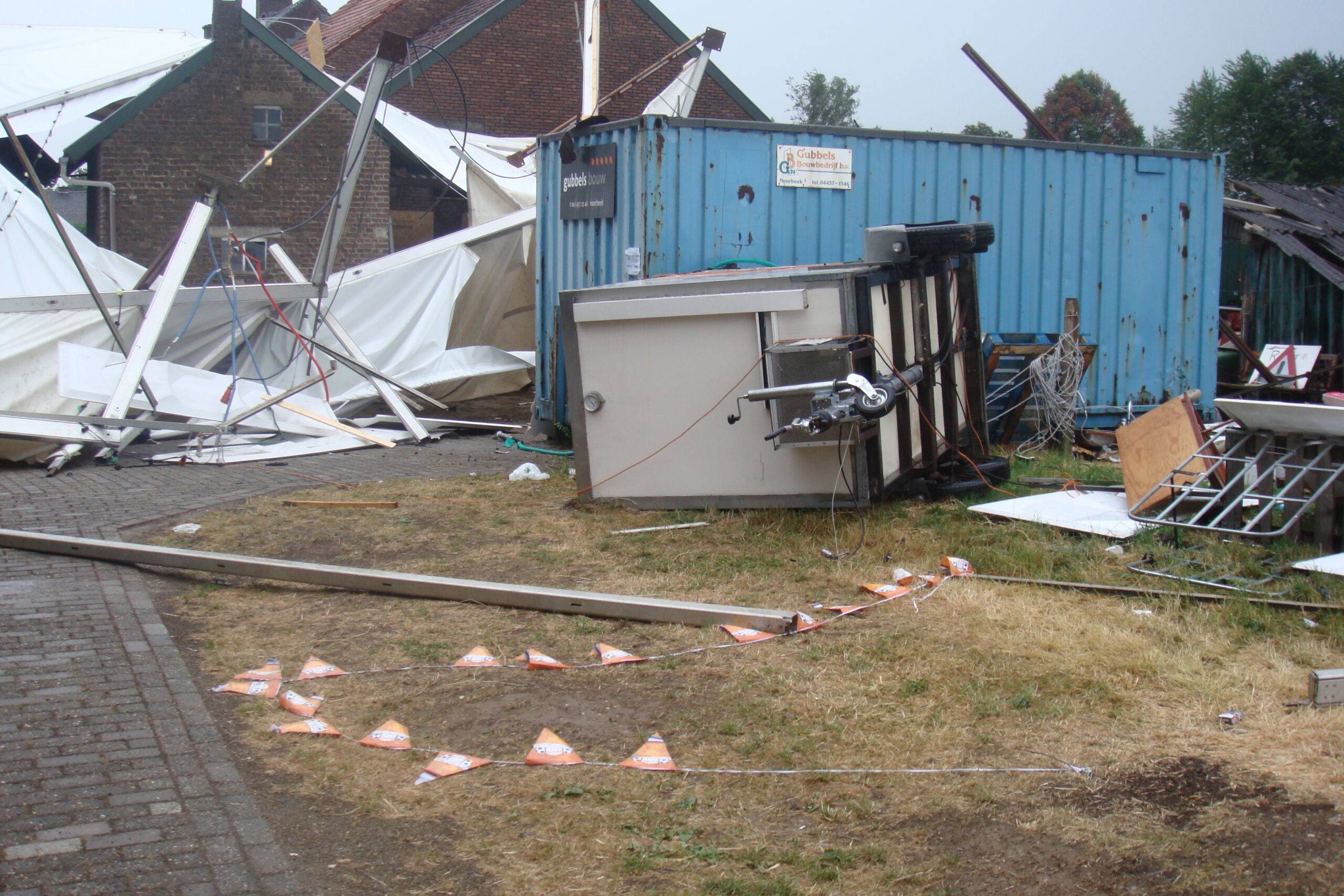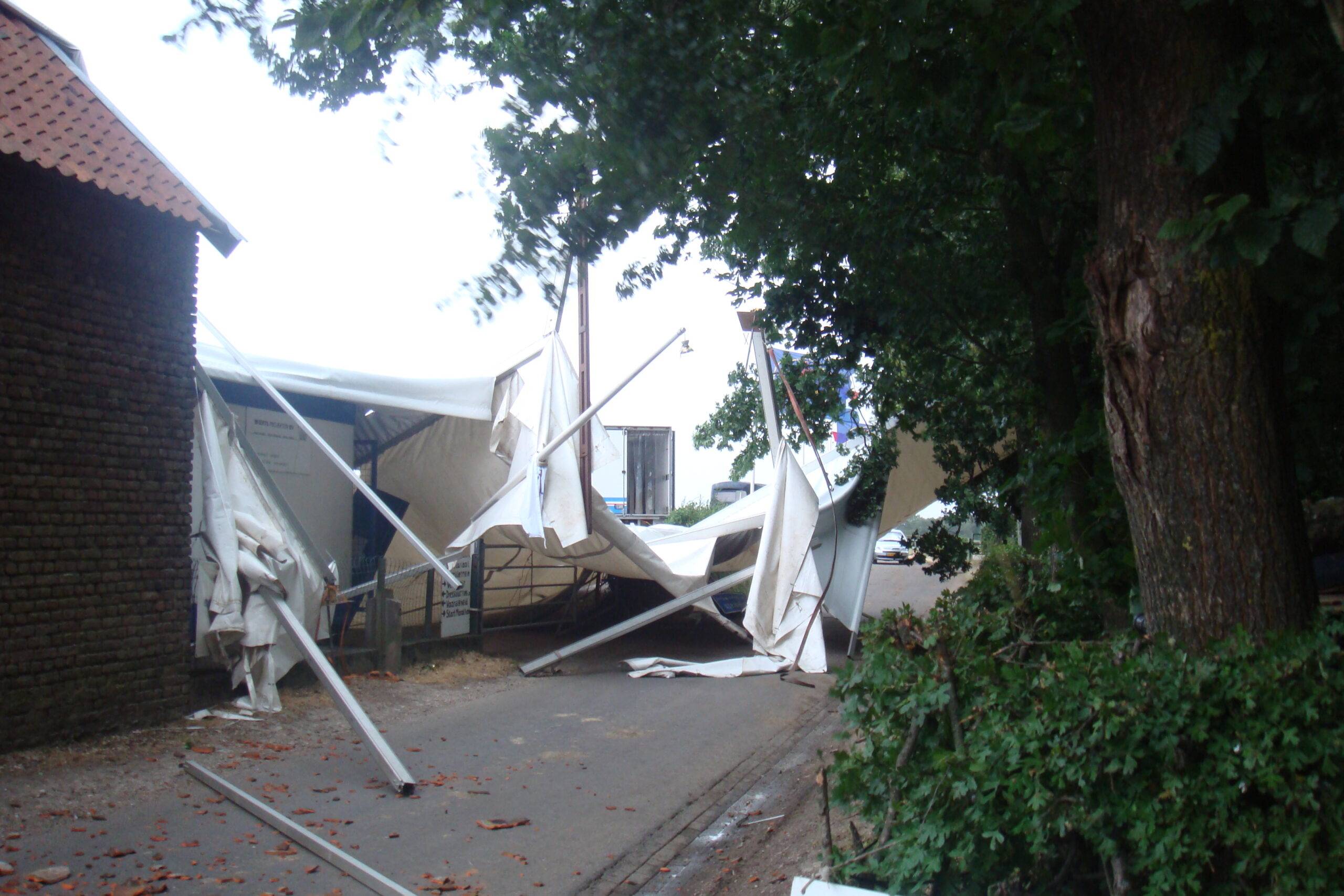 Maandag teisterden de weergoden de organisatie van Heijenrath echter weer en kwamen met een wel heel speciale verrassing. De storm die door Limburg raasde nam de grote consumptietent mee de lucht in. De tent, diverse auto’s, aanhangwagens en materialen zijn zover beschadigd dat ze niet meer bruikbaar zijn. De brandweer assisteerde de vele opgetrommelde vrijwilligers bij het opruimen van de grote puinhoop. Diverse daken, een stal en ander materiaal van terreineigenaar Ger Moors werden ook beschadigd door de windhoos. De vereniging heeft door de weergoden enorme materiale en financiële schade opgelopen en werkt nu met man en macht eraan om alles op te ruimen en eventueel te repareren. Onderstaand enkele foto’s van de ravage die de storm maandagmorgen aanrichtte.