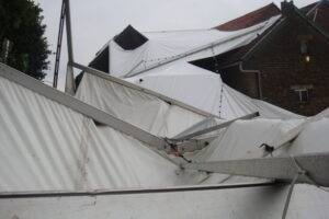 Maandag teisterden de weergoden de organisatie van Heijenrath echter weer en kwamen met een wel heel speciale verrassing. De storm die door Limburg raasde nam de grote consumptietent mee de lucht in. De tent, diverse auto’s, aanhangwagens en materialen zijn zover beschadigd dat ze niet meer bruikbaar zijn. De brandweer assisteerde de vele opgetrommelde vrijwilligers bij het opruimen van de grote puinhoop. Diverse daken, een stal en ander materiaal van terreineigenaar Ger Moors werden ook beschadigd door de windhoos. De vereniging heeft door de weergoden enorme materiale en financiële schade opgelopen en werkt nu met man en macht eraan om alles op te ruimen en eventueel te repareren. Onderstaand enkele foto’s van de ravage die de storm maandagmorgen aanrichtte.