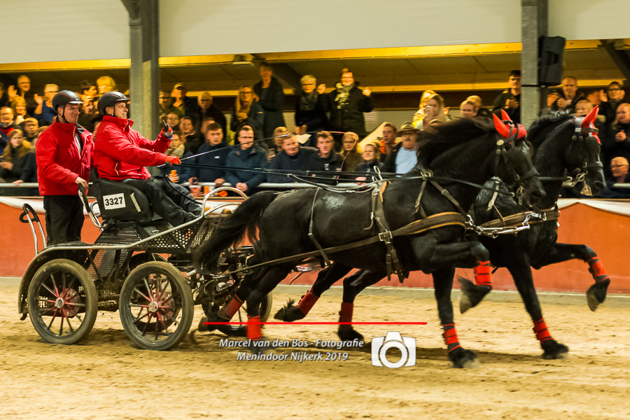 Ook bij de tweespan pony’s reden 10 aanspanningen in de finale. Thuisfavoriet Wout Kok had pech. Hij zwaaide iets teveel uit bij hindernis 3 waardoor hij poort 11 omreed en hij 15 strafseconden opliep. Gijs van Veluw bleef wel foutloos en klokte een tijd van 110,54. Maar Mandy van Delft reed haar schimmeltjes sneller rond en finishte in 109,03. Laatste starter Frans Marijnissen leek voor een onmogelijke opgave te staan. In de tussentijd lag hij nog wat achter, maar in de laatste lijn van het parcours ontwikkelde hij topsnelheid en kwam in 106,78 over de finish.