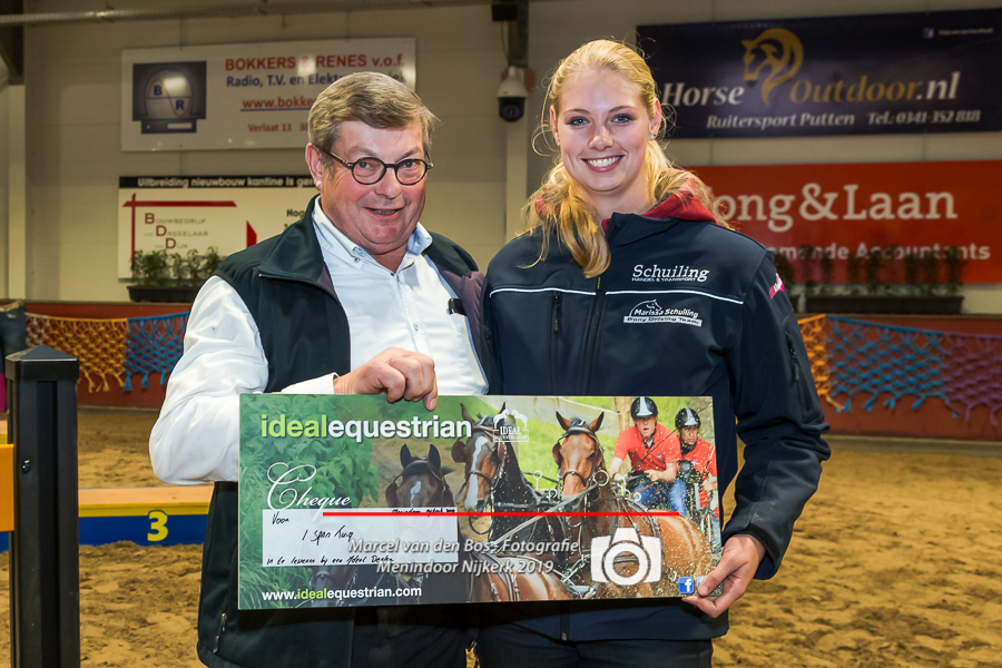 Na drie dagen van voorrondes gingen zaterdagavond de finales van Indoor Nijkerk van start. Manege Luxool was tot de nok toe gevuld met een uitzinnig publiek dat de finalisten vleugels gaf. Stuk voor stuk waren de finalerubrieken spannend. De allersnelste tijd van de avond werd op de klokken gezet door Marissa Schuiling met Kyra.Het parcours kende een aantal venijnige kegelpoorten en ook in de laatste lijn was het een kunst om vlak langs de tribunes de ballen op de kegels te laten liggen. Als eerste waren de ponyenkelspannen aan de beurt voor hun finaleparcours. Door de tien finalisten werden er nauwelijks fouten gemaakt. Lange tijd ging de Belg Christof Piccart aan de leiding met zijn kleine snelle vosje Aristocrat. Demi van den Brink kwam dicht in de buurt met Calvin, maar kwam enkele tienden van seconden tekort. Laatste starter Marissa Schuiling gaf de concurrentie het nakijken. Haar succespony Kyra is met internationaal wedstrijdpensioen, maar loopt nog wel wat indoors. Dat de merrie het indoorwerk leuk vindt, straalde er vanaf. Ze was ongelooflijk gretig en Marissa leidde haar vakkundig door de poorten en de hindernissen. Ze reden de allersnelste tijd van de avond en wonnen overtuigend in 102,9 seconden. Het feest was compleet toen aan het einde van de avond Marissa ook nog een extra prijs mee naar huis nam. Onder de podiumplekken werd als extra prijs een Ideal Equestrian enkelspantuig verloot. Aart van de Kamp sr. trok het lootje met Marissa’s naam uit de hoge hoed.