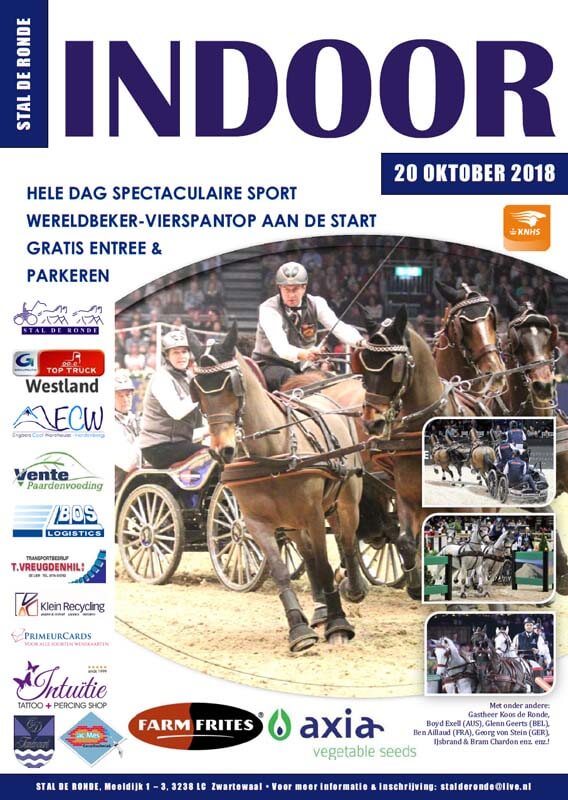 Wereldkampioen Boyd Exell, Bram en IJsbrand Chardon, Benjamin Aillaud, Georg von Stein, Glenn Geerts, ze komen allemaal op zaterdag 20 oktober naar Stal De Ronde in Zwartewaal voor de eerste échte warming up van het Wereldbekerseizoen 2018-2019.Gastheer en regerend Nederlands kampioen Koos de Ronde is meer dan tevreden. ‘Twee jaar geleden hebben we voor het eerst een speciale internationale rubriek uitgeschreven voor vierspannen en daar is vraag naar. Natuurlijk hebben wij de datum van ons evenement gekozen om zo optimaal mogelijk in de kalender te liggen als eerste test voordat het Wereldbekerseizoen van start gaat. Het dak gaat eraf op de twintigste’, aldus De Ronde die zelf ook één van de twaalf vierspanrijders is die voor een topavond gaat zorgen.